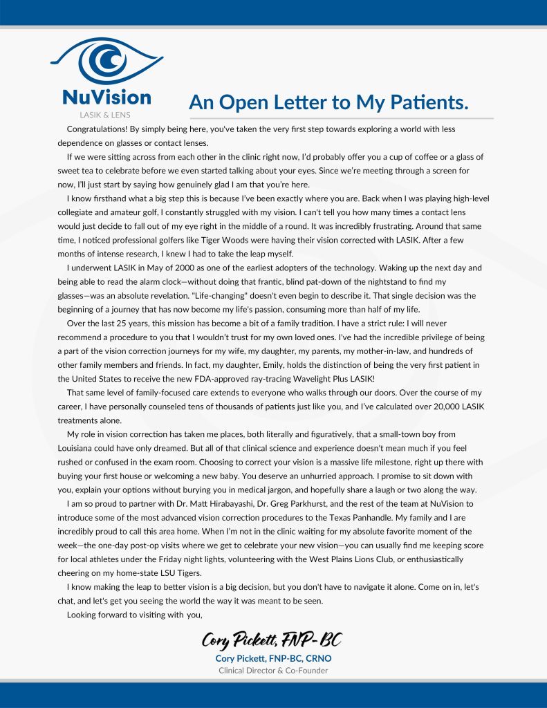 Cory and his family have developed a deep love for the Texas Panhandle and are proud to call it home. He is excited to partner with one of the leading refractive surgery centers in the world to bring revolutionary new technology and techniques to the people of the area. Cory is also a charter member of the West Plains Lions Club and frequently volunteers his time to support local athletes, helping them gain visibility on social media and serving as a game-day scorer for MaxPreps. When his schedule permits, he enjoys spending quality time with his family, supporting local sports teams, and cheering on his home-state LSU Tigers.